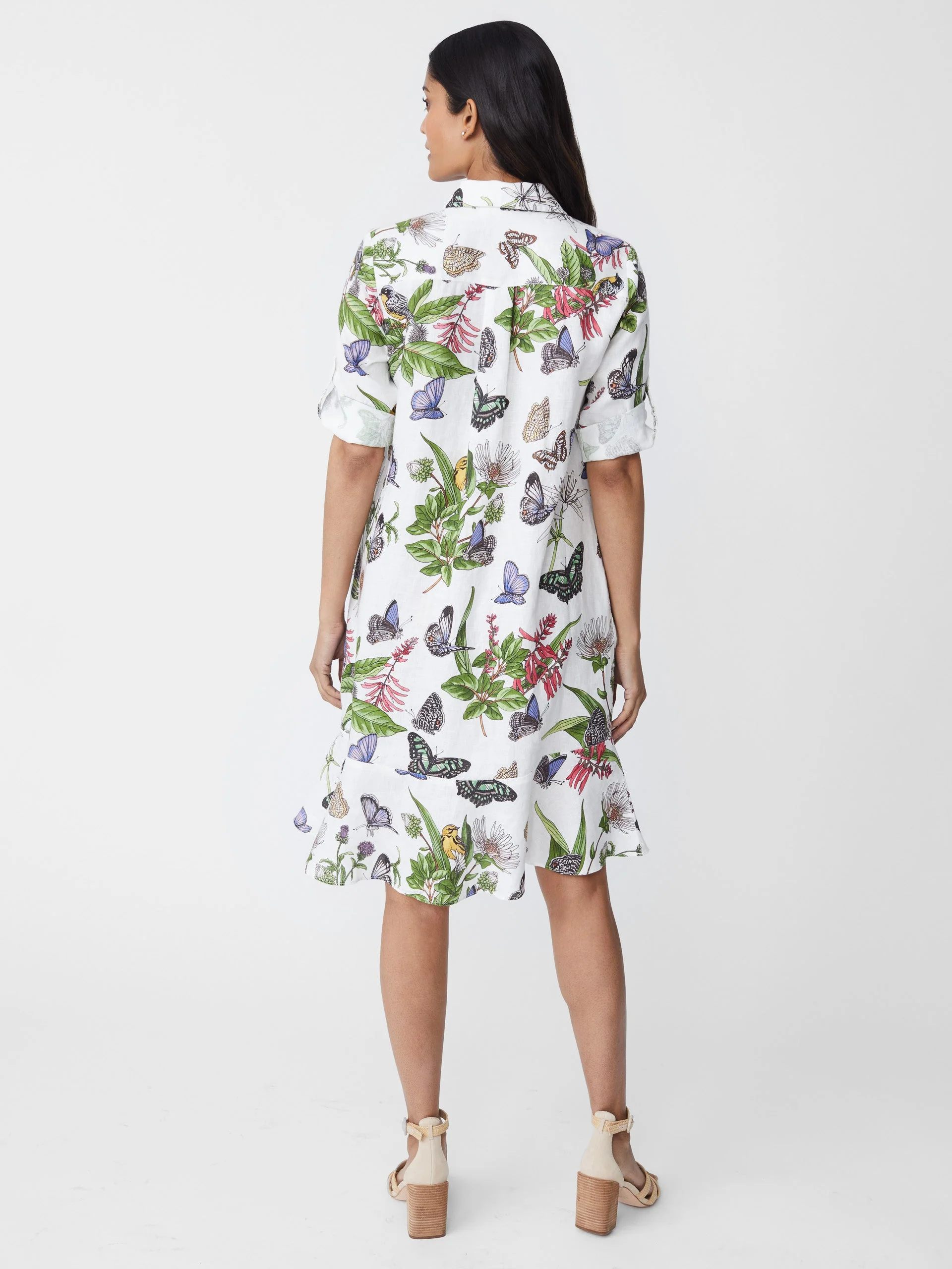 An airy linen shirt dress with a feminine ruffled hem. Stay polished and chic in our Jardin Mariposa print Wellesley dress.